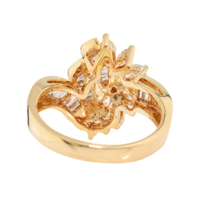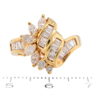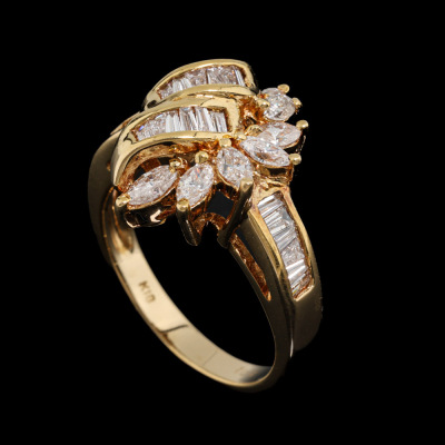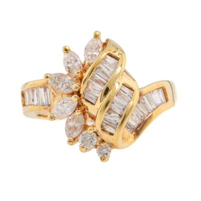 Diamond dress ring with round, marquise & baguette cut Natural Diamonds totalling 1.04ct (Estimated grading: I-J SI-P1). 18ct yellow gold. Ring size L1/4. Band width: 2.7mm-3.5mm. Weight: 6.3g. (Pre-owned)