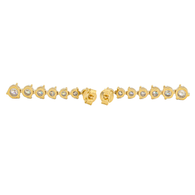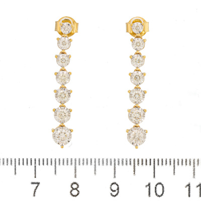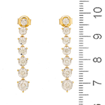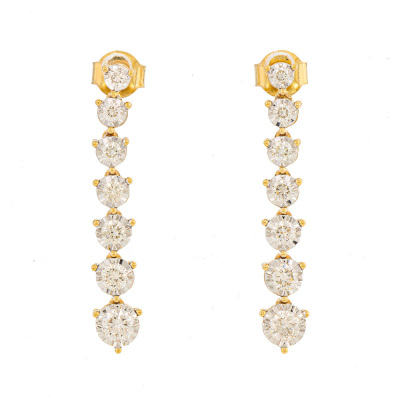 Diamond drop earrings with 14 round Natural Diamonds totalling 1.04ct (Estimated grading: H-I SI). Note - Diamonds graduating in size. 14ct yellow gold. Earrings drop length: 3.1cm. Weight: 4.0g. (New)