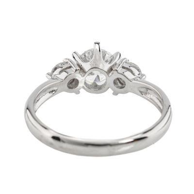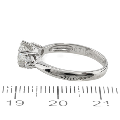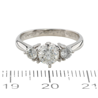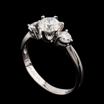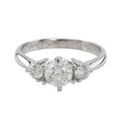 Diamond trilogy ring with centre round Natural Diamond of 0.71ct (Estimated grading: I-J P1) and 2 shoulder round Natural Diamonds totalling 0.33ct (Estimated grading: H-I SI). Platinum - 900. Ring size L. Band width: 2.3mm - 2.6mm. Weight: 4.0g. Engraved with '93.1.24 M to Y'. (Pre-owned)