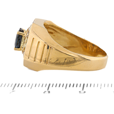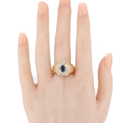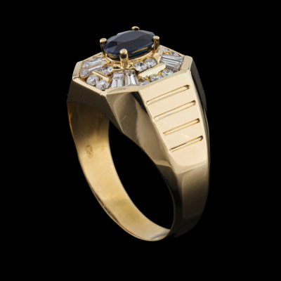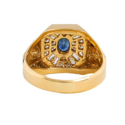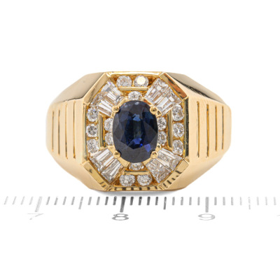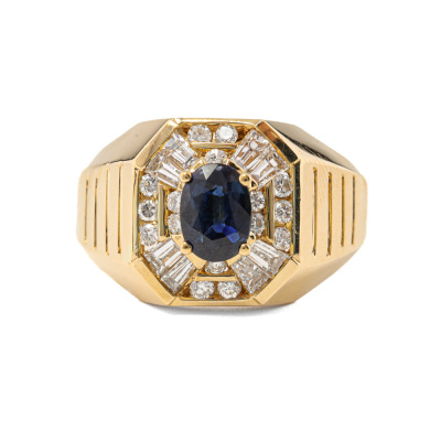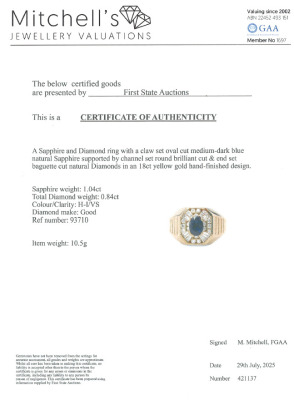 Mens ring with oval shape Natural Blue Sapphire of approximately 1.04ct and round & baguette cut Natural Diamonds totalling approximately 0.84ct (Estimated grading: H-I VS). 18ct yellow gold. Ring size W. Band width: 4.1mm-6.7mm. Weight: 10.5g. With Certificate #421137.