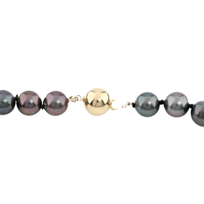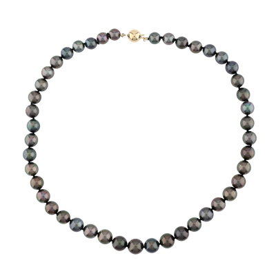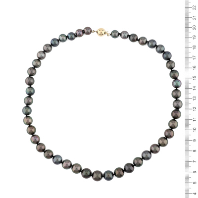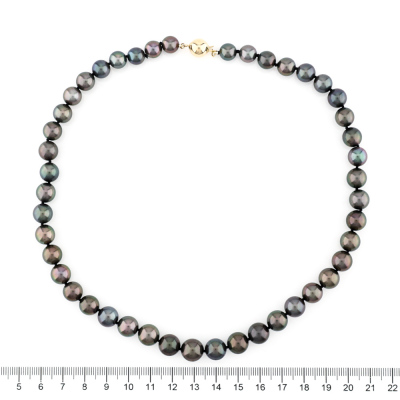 Pearl strand necklace with 45 graduated Tahitian Pearls of 10.4mm - 8.1mm. 14ct yellow gold 9mm ball clasp. Length: 46cm. Weight: 50.0g. (As New)
