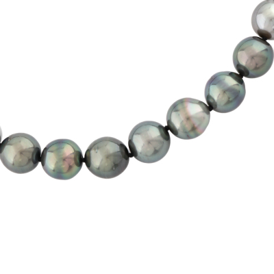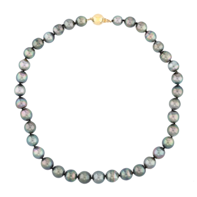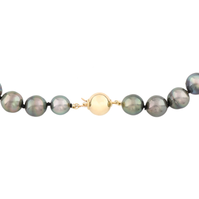 Pearl necklace with 37 Tahitian Pearls from 10.5mm - 8.3mm. 14ct yellow gold 10mm ball clasp. Length: 41.5cm