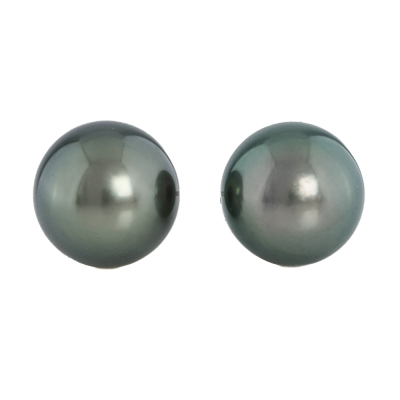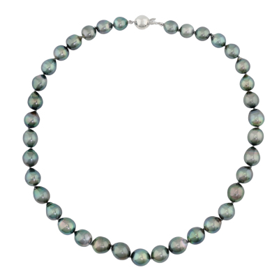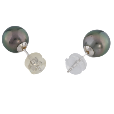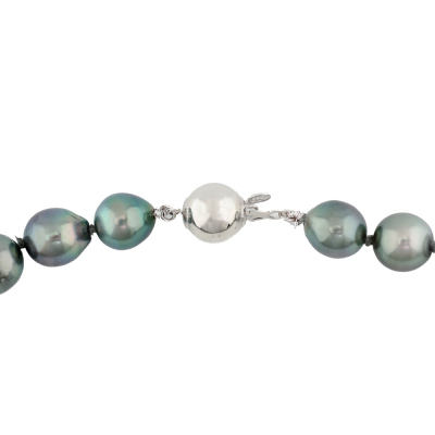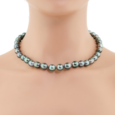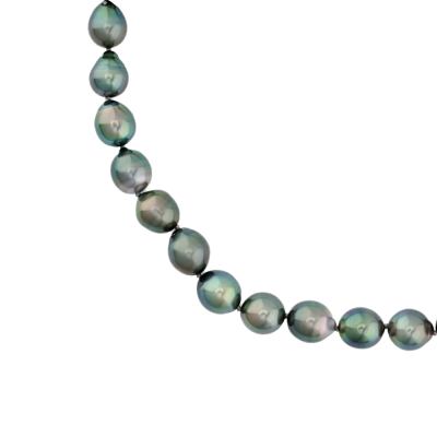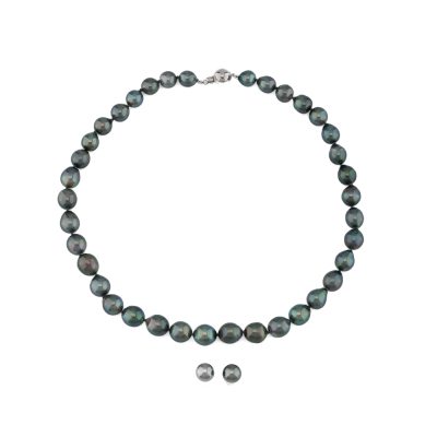 Pearl necklace and earrings set. 1) Pearl strand necklace with 37 drop & oval shape Tahitian Pearls of 8.4mm - 10.5mm. 14ct white gold 9mm ball clasp. Length: 43.5cm. 2) Pearl stud earrings with Tahitian Pearls of 9mm & 9.1mm. 18ct white gold posts, one with a 18ct white gold & silicone back and the other with a silicone back. Total weight: 53.0g.