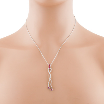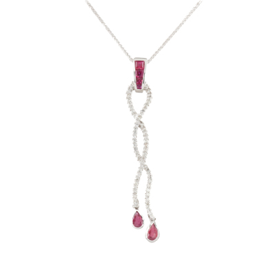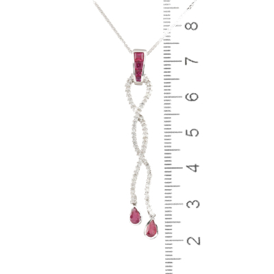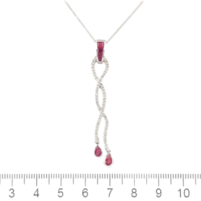 Ruby and Diamond pendant with pear & carre cut Natural Rubies totalling 1.05ct and round Natural Diamonds totalling 0.41ct (Estimated grading: I-J SI-P1). 18ct white gold and 18ct white gold 45cm adjustable chain. Weight: 5.9g. (pre-owned)