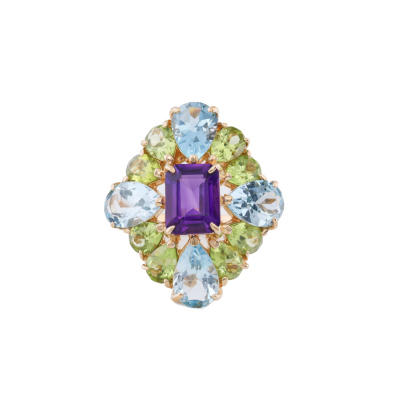 Multi-colour Gemstone ring with centre emerald cut Amethyst of approximately 1.60ct, 4 pear shape Natural blue Topaz totalling approximately 6.00ct and pear shape Natural Peridot totalling approximately 3.00ct. 18ct yellow gold. Ring size M. Band width: 2.6mm-3.9mm. Weight: 9.4g. (Pre-owned)