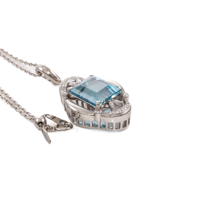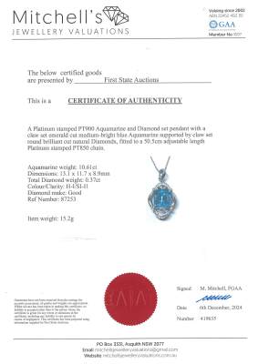 Aquamarine and Diamond enhancer pendant with emerald cut Natural Aquamarine of 10.61ct and round Natural Diamonds totalling 0.37ct (Estimated grading: H-I SI-P1). Platinum-900 with Platinum-850 adjustable 50.5cm chain. Weight: 15.2g. With Certificate #419635. (Pre-owned)