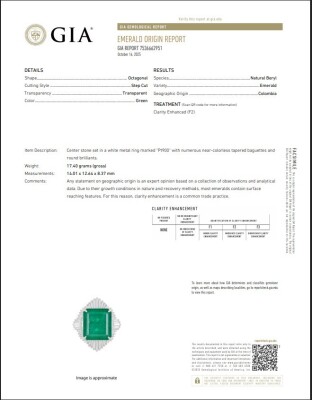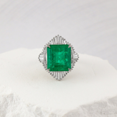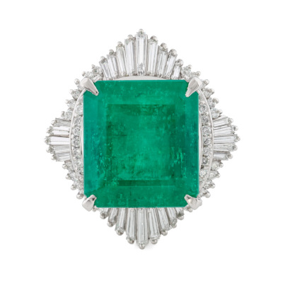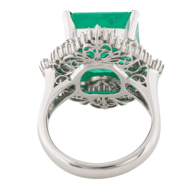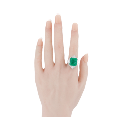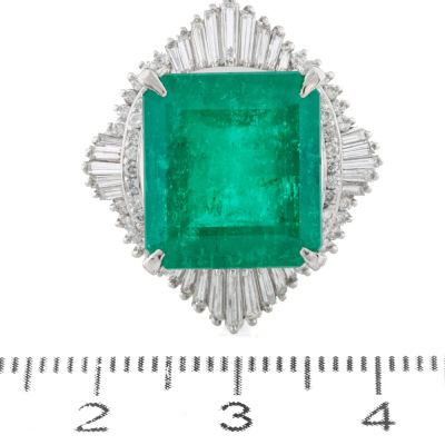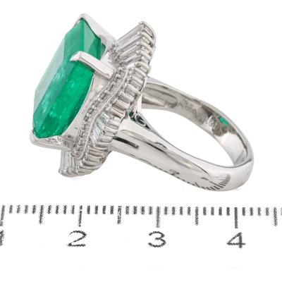 Emerald and Diamond ring with centre emerald cut Colombian Natural Emerald of 10.61ct (with GIA Report graded #7536662951) and round & baguette cut Natural Diamonds totalling approximately 1.00ct (Estimated grading: G-H VS-SI). Platinum - 900. Ring size M. Band width: 3.8mm - 4.0mm. Weight: 17.3g