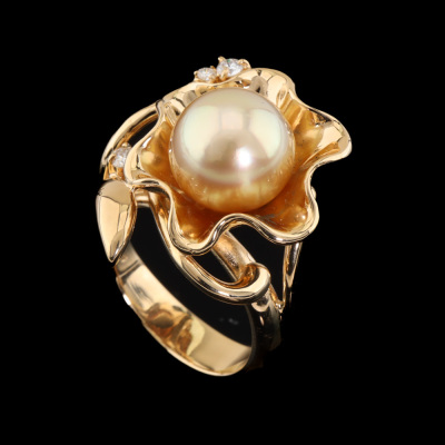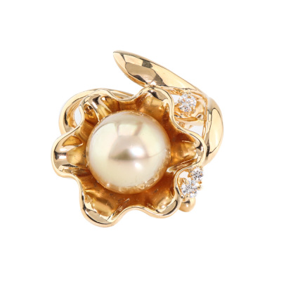 Floral design ring with centre Golden South Sea Pearl of approximately 10.6mm and round Natural Diamonds totalling 0.11ct. 18ct yellow gold. Ring size L. Band width: 4.3mm - 3.2mm. Weight: 11.9g. (Pre-owned)