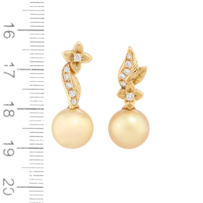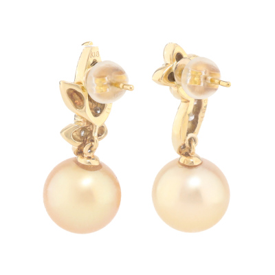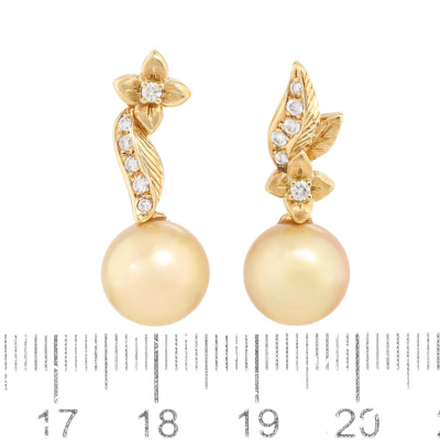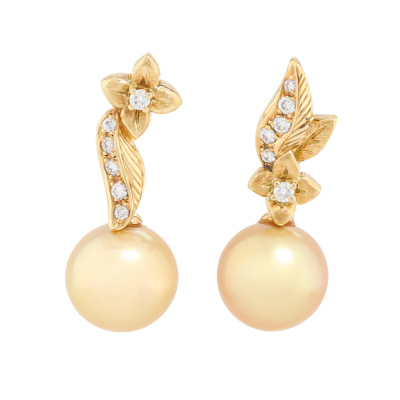 Mix and match floral design earrings with Golden South Sea Pearl of 10.8mm & 10.5mm and round Natural Diamonds totalling 0.22ct. 18ct yellow gold with 18ct yellow gold & silicon backs. Weight: 7.8g. (Pre-owned)