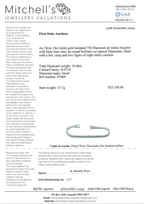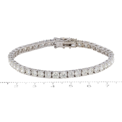 Diamond tennis bracelet with 44 round Natural Diamonds totalling 10.86cts (Estimated grading: H-I VS). 18ct white gold. Length: 18cm. Weight: 13.7g. With Valuation Certificate #422021. (New)