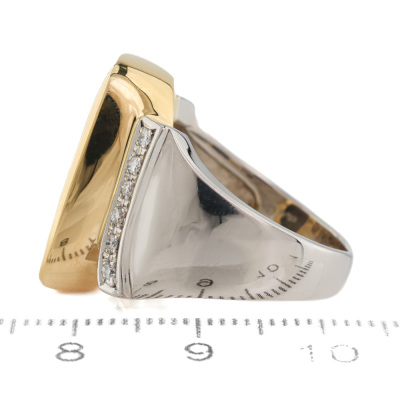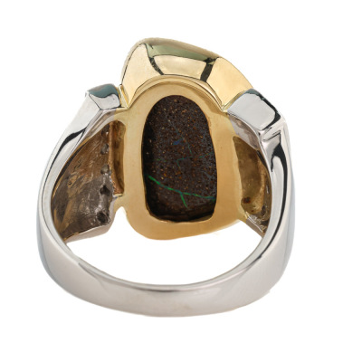 Opal and Diamond ring with freeform Natural Solid Boulder Opal of 10.91ct and round Natural Diamonds totalling 0.15ct. 18ct yellow gold and Platinum - 900. Ring size Q1/2. Band width: 3.1mm - 6.3mm. Weight: 19.2g. (Pre-owned)
