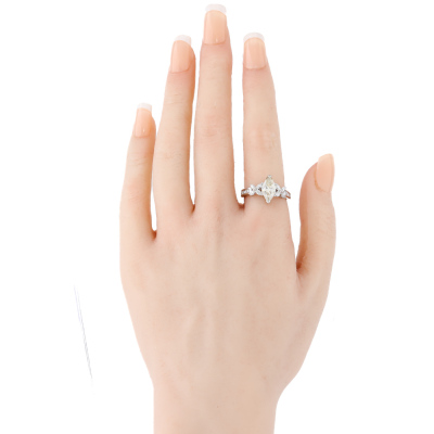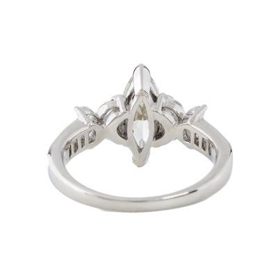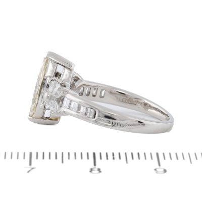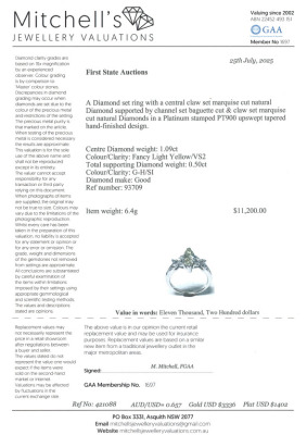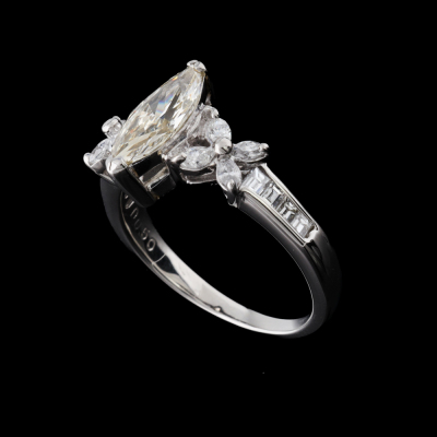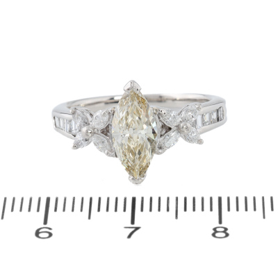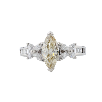 Diamond ring with centre marquise cut Natural Diamond of 1.09ct (Estimated grading: Fancy Light Yellow VS2) and shoulder marquise & baguette cut Natural Diamonds totalling 0.50ct (Estimated grading: G-H SI). Platinum - 900. Ring size N. Band width: 1.7mm-3.2mm. Weight: 6.4g. With Certificate #421088. (Pre-owned)