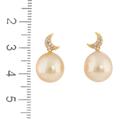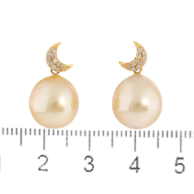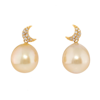 Pearl and moon design Diamond drop earrings with drop shape Golden South Sea Pearls of 10.9mm and round Natural Diamonds totalling approximately 0.10ct. 18ct yellow gold with 18ct yellow gold & silicon backs. Drop length: 2cm. Weight: 4.9g. (Pre-owned)