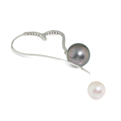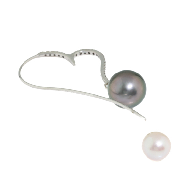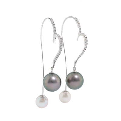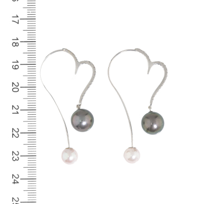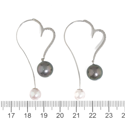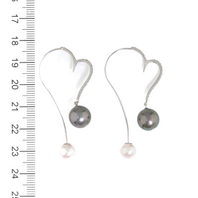 Heart shape earrings with Tahitian Pearls of 10mm, earring backs with Akoya Pearl of 7mm and round Natural Diamonds totalling 0.28ct. 18ct white gold. Length: 5cm. Weight: 6.4g. (Pre-owned)