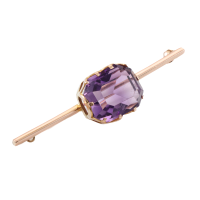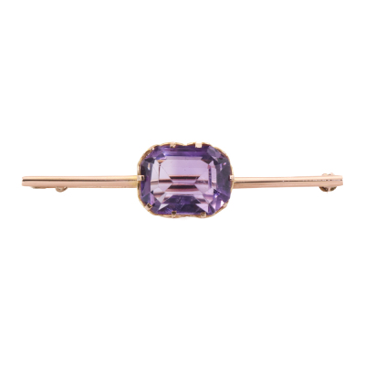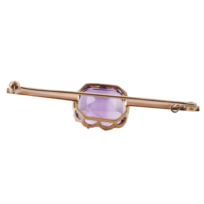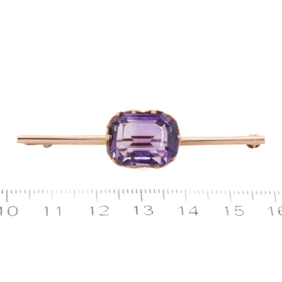 Amethyst bar brooch with an emerald cut Natural Amethyst of approximately 11.00ct. 9ct rose gold (XRF tested, no stamp). Length: 5.6cm. Weight: 5.9g. (Pre-owned)