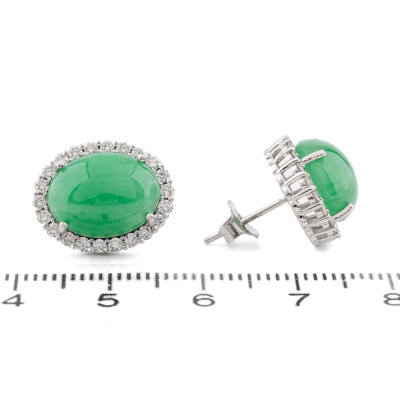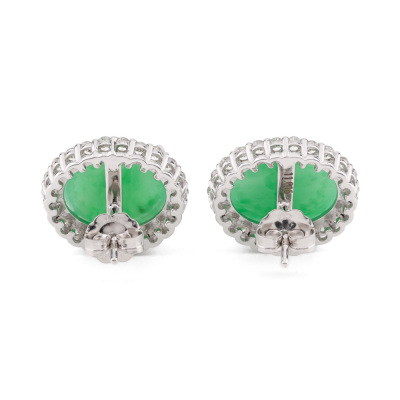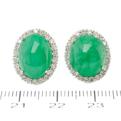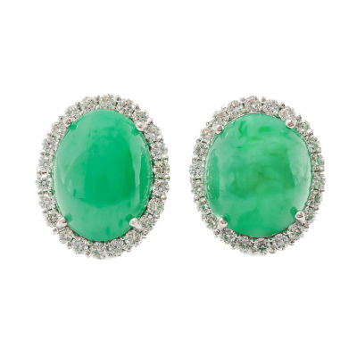 Jade and Diamond earrings with oval cabochon cut Natural Green Jadeite Jade - Type A totalling 11.01ct and round Natural Diamonds totalling 0.75ct (Estimated grading: I-J SI). 18ct white gold. Weight: 6.1g. (Pre-owned)