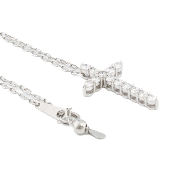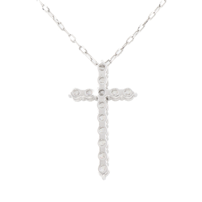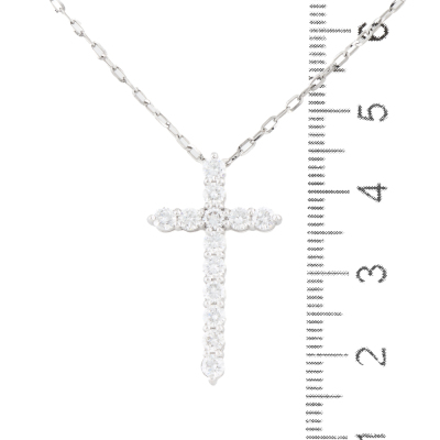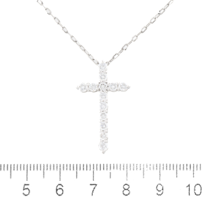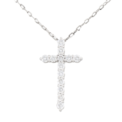 Diamond cross design pendant with round Natural Diamonds totalling 1.10ct (Estimated grading: G-H SI). Platinum 900 with 45cm maximum length, adjustable Platinum 850 chain. Weight: 5.8g. (pre-owned)