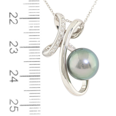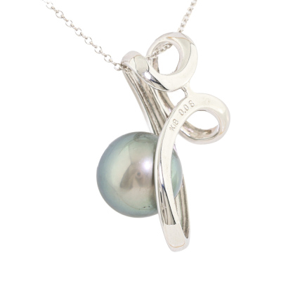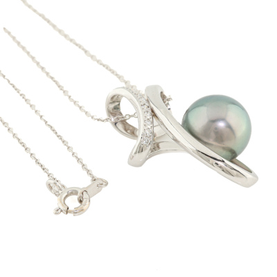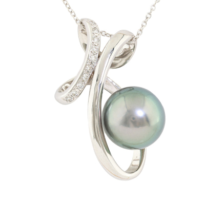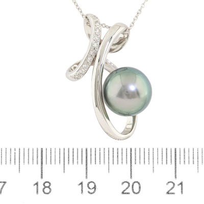 Pearl and Diamond pendant with Tahitian Pearl of 11.0mm and round Natural Diamonds totalling 0.08ct. 18ct white gold with 41cm 18ct white gold chain. Weight: 6.2g.