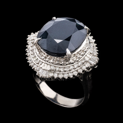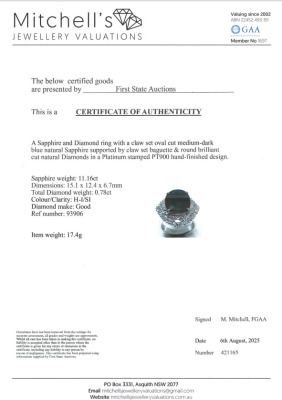 Sapphire and Diamond ring with oval shape Natural Dark Blue Sapphire of 11.16ct and round & baguette cut Natural Diamonds totalling 0.78ct (Estimated grading: H-I SI). Platinum - 900. Ring size K1/4. Band width: 3.7mm - 4.5mm. Weight: 17.4g. With Certificate #421165. (Pre-owned)