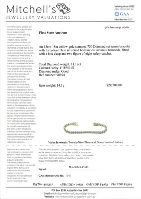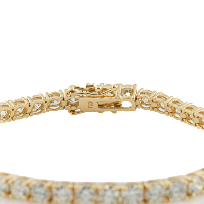 Diamond tennis bracelet with 44 round Natural Diamonds totalling 11.18ct (Estimated grading: HIJ VS-SI). 18ct yellow gold. Length: 18.5cm With Valuation Certificate #422327.