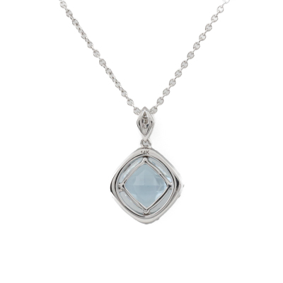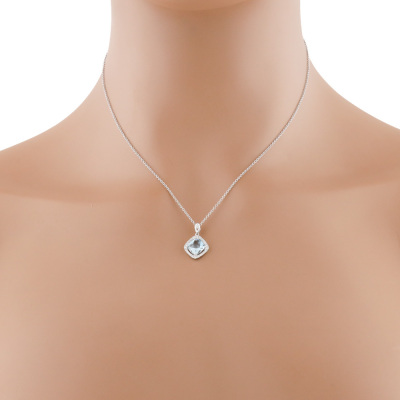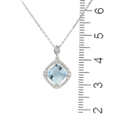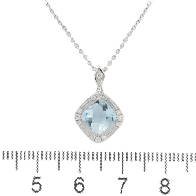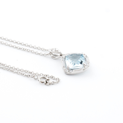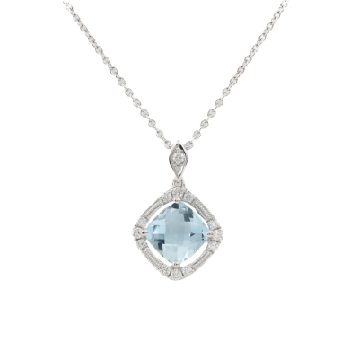 Aquamarine and Diamond pendant with cushion cut natural Aquamarine of 1.11ct and round natural Diamonds totalling 0.15ct. 14ct white gold with 40cm 14ct white gold chain. Weight: 2.3g. (New)