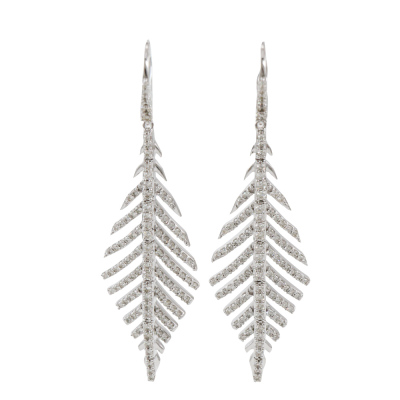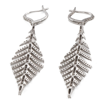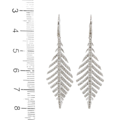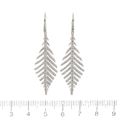 Diamond leaf design earrings with 206 round Natural Diamonds totalling 1.11ct (Estimated grading: H-I SI). 14ct white gold. Length: 5.1cm. Weight: 6.4g. (New).