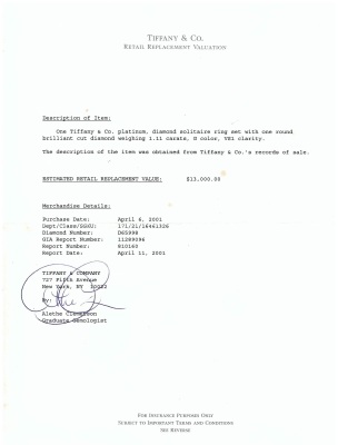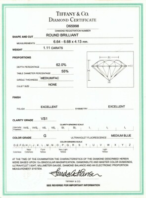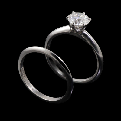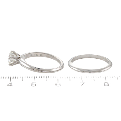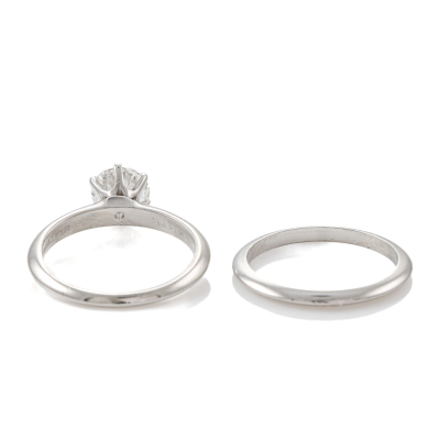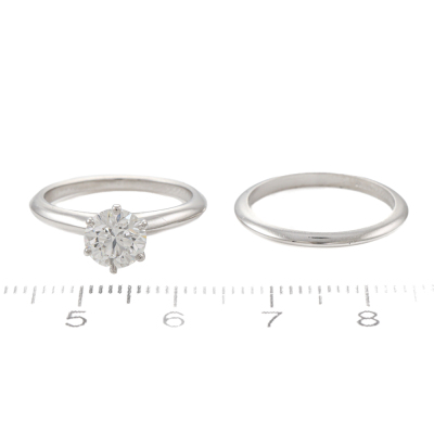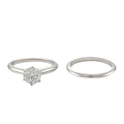 Tiffany & Co. Engagement ring set. 1)Tiffany & Co. The Tiffany Setting Engagement ring with round Natural brilliant cut Diamond 1.11ct (Tiffany & Co. Diamond Certificate graded as G VS1 #D65998 & GIA Certificate #11289096). Diamond ring size: L. Band width: 1.7mm - 2.4mm. 2) Tiffany & Co. Wedding band. Ring size: K3/4. Band width: 1.8mm. Both Platinum 950. Total weight: 7.1g. With Tiffany & Co. Valuation Certificate dated 11/04/2001. (Pre-owned)