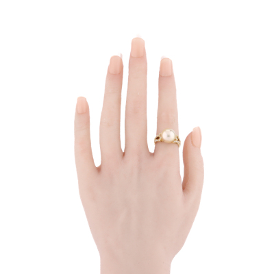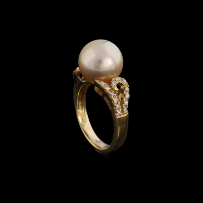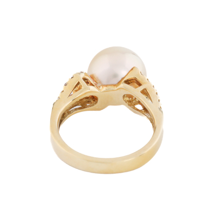 Pearl and Diamond ring with centre Golden South Sea Pearl of 11.1mm and round Natural Diamonds totalling 0.16ct. 18ct yellow gold. Ring size L. Band width: 2.9mm - 3.6mm. Weight: 7.4g. (Pre-owned)