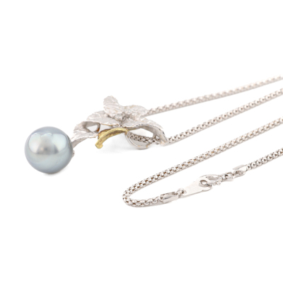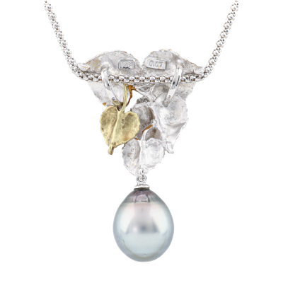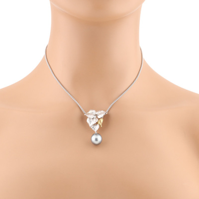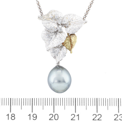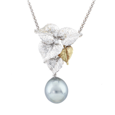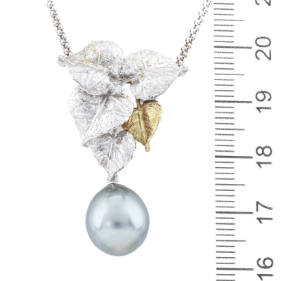 Leaf design pendant with a drop shape Tahitian Pearl of 11.1mm and 3 round Natural Diamonds totalling 0.07ct. 18ct white and yellow gold matte finish pendant with 40cm 18ct white gold chain. Weight: 9.8g.