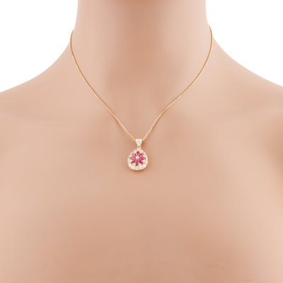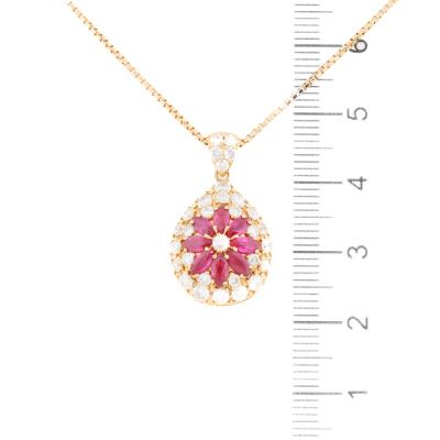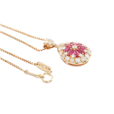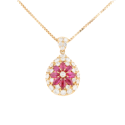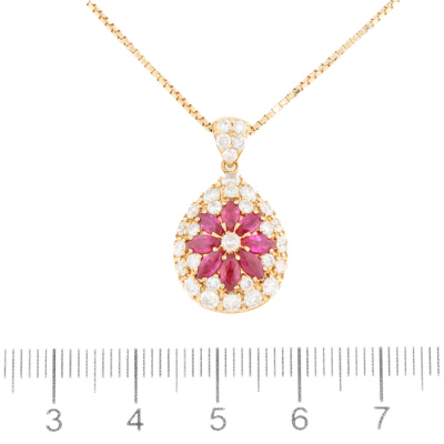 Ruby and Diamond pendant with marquise cut Natural Rubies totalling 1.12ct and round Natural Diamonds totalling 1.08ct (Estimated grading: G P1). 18ct yellow gold with 36cm - 41cm 18ct yellow gold chain. Weight: 7.9g. (Pre-owned)