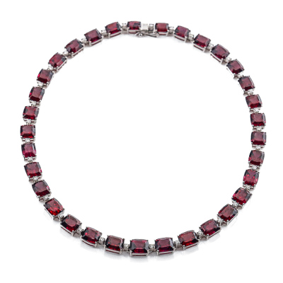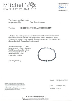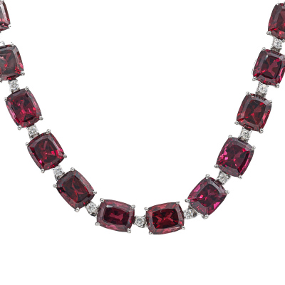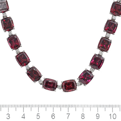 Garnet and Diamond necklace with 33 cushion cut Natural Rhodolite Garnets totalling 113.00ct and round Natural Diamonds totalling 1.88ct (Estimated grading: G-H SI-P1). 18ct white gold. Length: 41.5cm. Weight: 65.2g. With Certificate #420712. (Pre-owned)