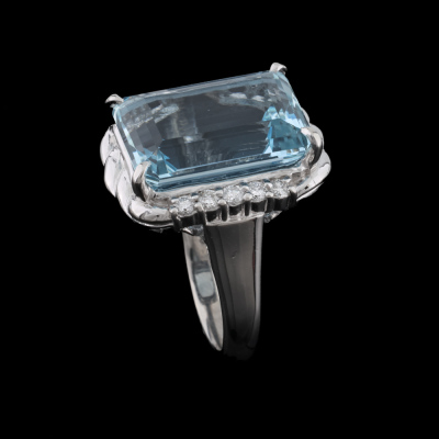 Aquamarine and Diamond ring with centre emerald cut Natural Aquamarine of 11.36ct and 10 round Natural Diamonds totalling 0.30ct (Estimated grading: G VS). Platinum - 900. Ring size O. Band width: 2.9mm - 4.0mm. Weight: 14.0g. (Pre-owned).