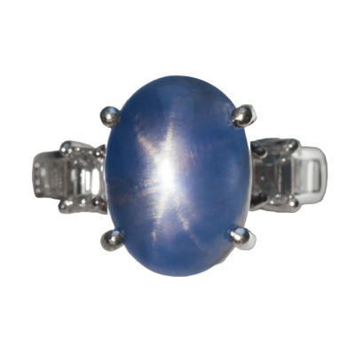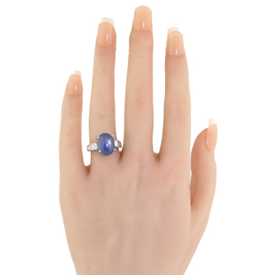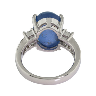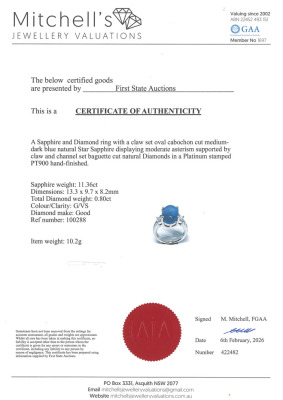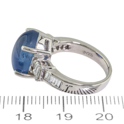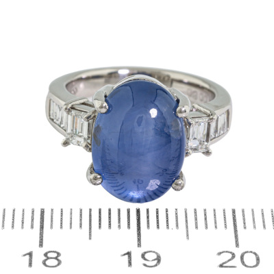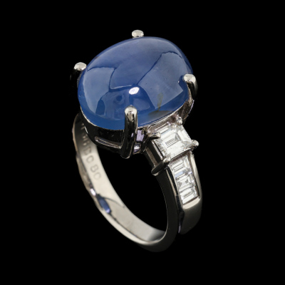 Sapphire and Diamond ring with oval cabochon cut Natural Blue Star Sapphire of 11.36ct and round Natural Diamonds totalling 0.80ct (Estimated grading: G VS). Platinum - 900. Ring size: K1/4. Band width: 3.0mm - 3.8mm. Weight: 10.2g. With Certificate #422482.