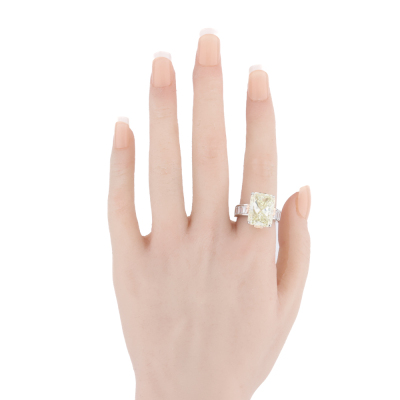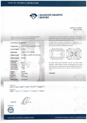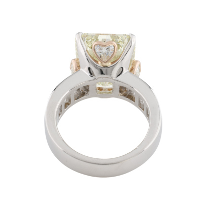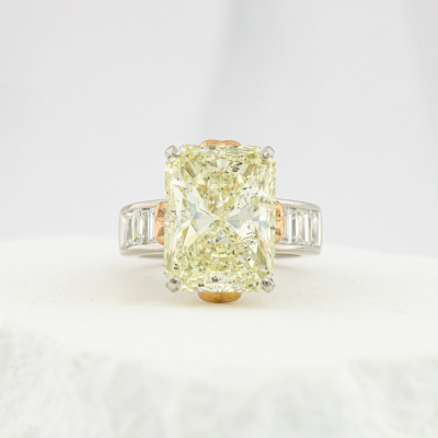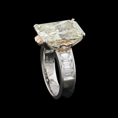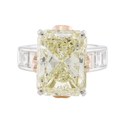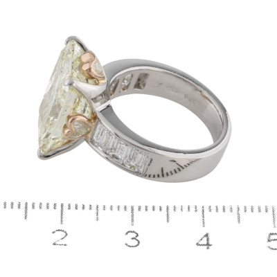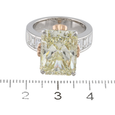 Diamond ring with centre rectangular radiant cut Natural Diamond of 11.37ct (with GSL Report graded as Natural Light Yellow R, P1 # AA7149/2) and 6 shoulder emerald cut Natural Diamonds totalling 1.91ct (Estimated grading: H SI). Platinum - 900 and 18ct rose gold. Ring size N. Band width: 4.6mm - 5.6mm. Weight: 14.9g. (Pre-owned)