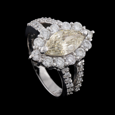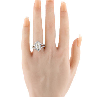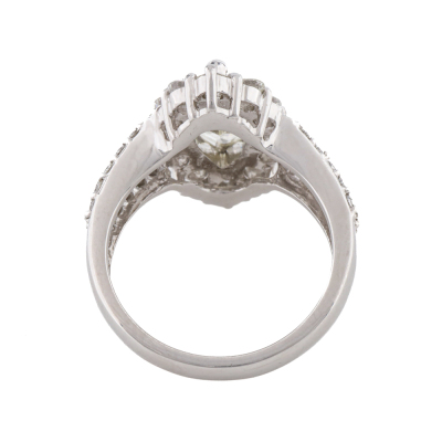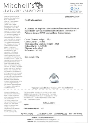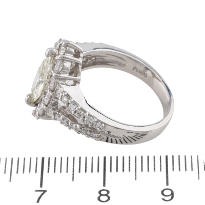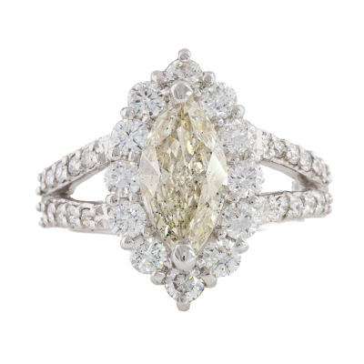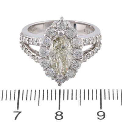 Diamond halo ring with centre marquise cut Natural Diamond of 1.13ct (Estimated grading: LM SI2) and surrounding round Natural Diamonds totalling 1.08ct (Estimated grading: GH VS-SI). Platinum - 900. Band width: 2.8mm - 4.0mm. With Valuation Certificate #422765.