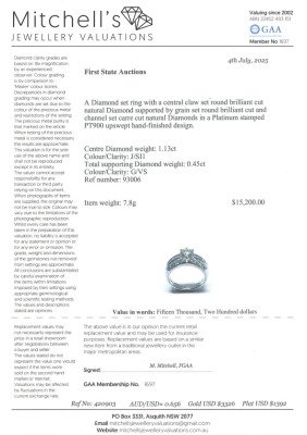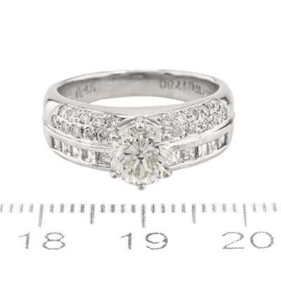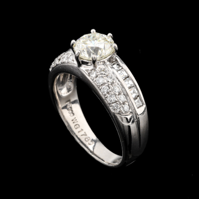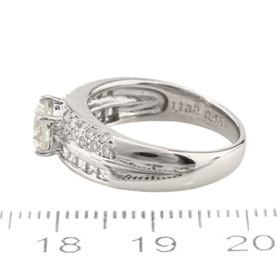 Diamond ring with centre round Natural Diamond of 1.13ct (Estimated grading: J SI) and round & carre cut Natural Diamonds totalling 0.45ct (Estimated grading: G VS). Platinum - 900 (XRF tested, stamped 'Pt900'. Ring size L. Band width: 3.0mm - 5.8mm. Engraved with 'WG 1780'. Weight: 7.8g. With Certificate #420903. (Pre-owned)