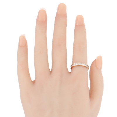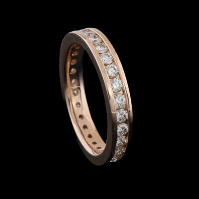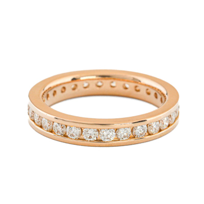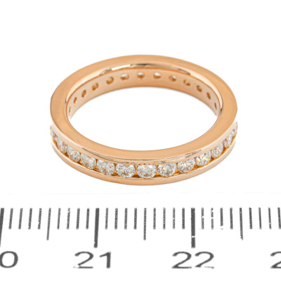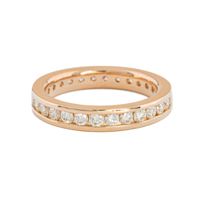 Diamond full hoop eternity ring with round Natural Diamonds totalling 1.13ct (Estimated grading: H-I VS). 18ct rose gold. Ring size K1/2 - ring resizing is not recommended. Band width: 3.3mm. Weight: 4.7g. (Pre-owned)