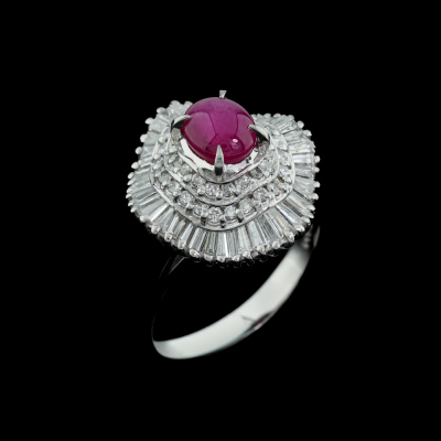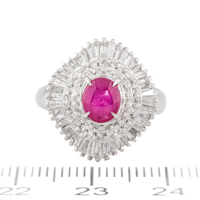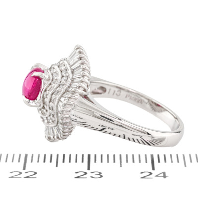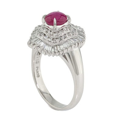 Ruby and Diamond ring with centre oval cabochon cut Natural Ruby of 1.13ct and surrounding round & baguette cut Natural Diamonds totalling 0.97ct (Estimated grading: G P1-P2). Platinum-900. Ring size L. Band width: 2.7mm - 3.5mm. Weight: 9.4g. (As New)
