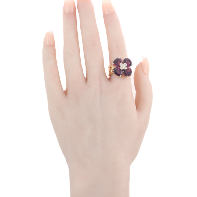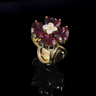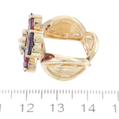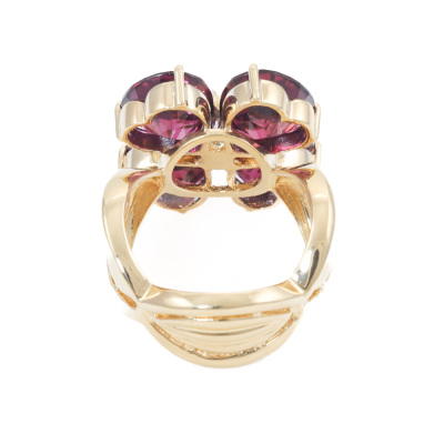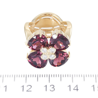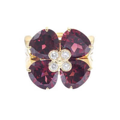 Clover ring with 4 pear shape Natural Rhodolite Garnet totalling 11.43ct and round Natural Diamonds totalling 0.18ct. 18ct yellow gold. Ring size L - ring resizing is not recommended. Band width: 11mm - 5.5mm. Weight: 14.0g. With Certificate #420334. (Pre-owned)
