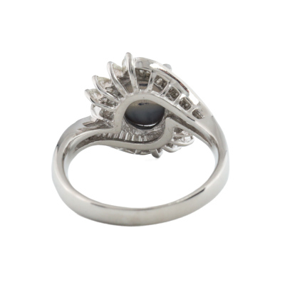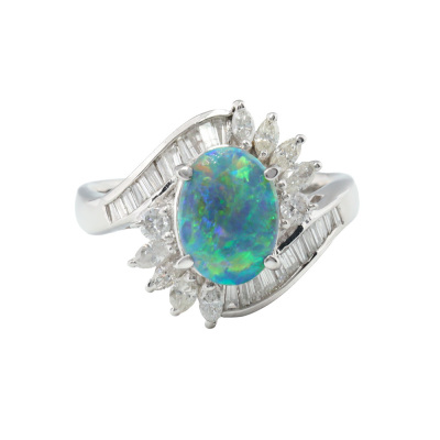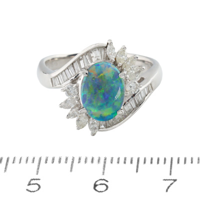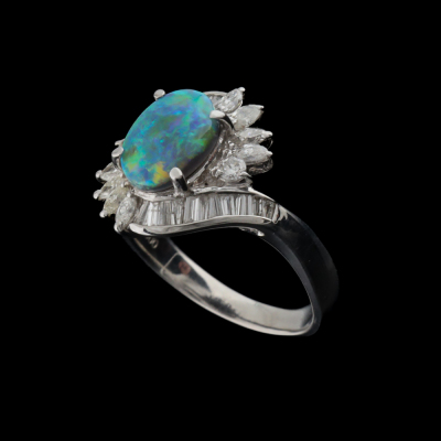 Opal and Diamond ring with oval cabochon cut Natural Black Opal of 1.14ct and round, baguette & marquise cut Natural Diamonds totalling 0.66ct (Estimated grading: H SI). Platinum 900. Ring size M. Band width: 2.4mm-3.1mm. Weight: 6.7g. (Pre-owned)