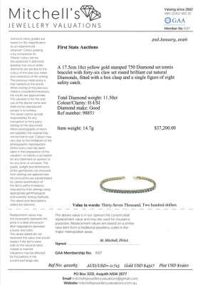 Diamond tennis bracelet with 46 round Natural Diamonds totalling 11.50ct (Estimated grading: HI SI). 18ct yellow gold. Length: 17.5cm. Weight: 14.7g. With Valuation certificate #422285..