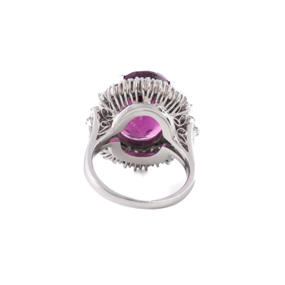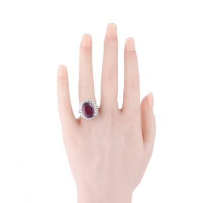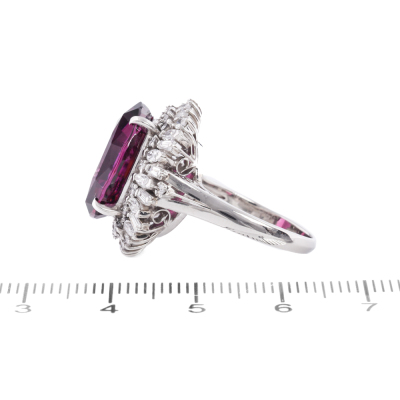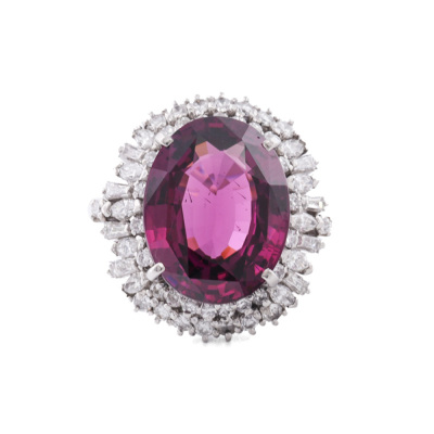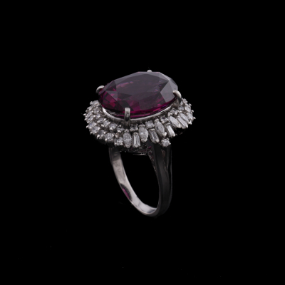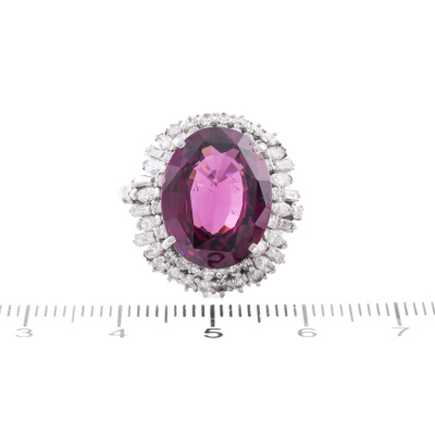 Garnet and Diamond ring with centre oval shape Natural Rhodolite Garnet of 11.51ct and round, baguette & marquise cut Natural Diamonds totalling 1.20ct (Estimated grading: G-H VS-SI). Platinum - 900. Ring size L. Band width: 1.8mm - 2.7mm. Weight: 14.2g. (Pre-owned)