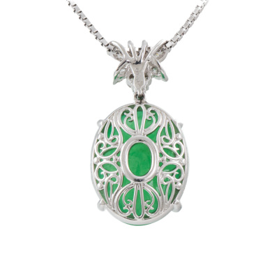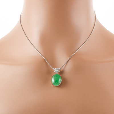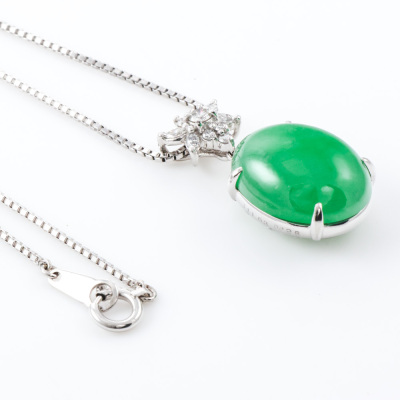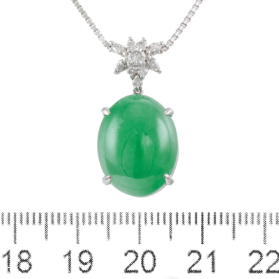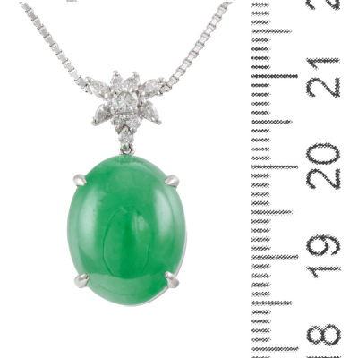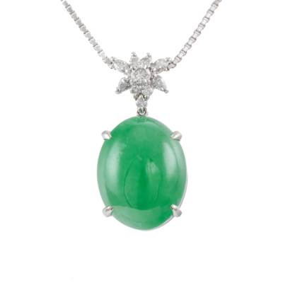 Jade and Diamond pendant with oval cabochon cut Natural Green Jadeite Jade - Type A of 11.53ct and round & marquise cut Natural Diamonds totalling 0.25ct. Platinum - 900 with 40cm Platinum 850 chain. Weight: 10.2g. (Pre-owned)