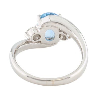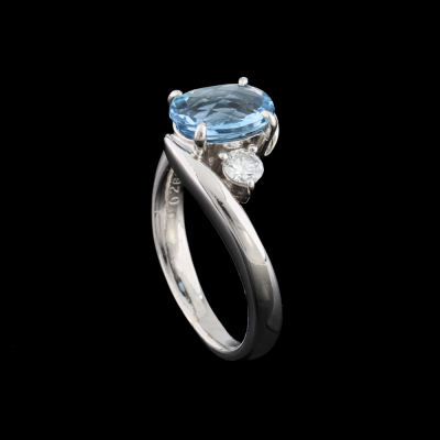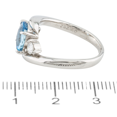 Aquamarine and Diamond ring with an oval shape Natural Aquamarine of 1.15ct and 2 shoulder round Natural Diamonds totalling 0.26ct (Estimated grading: H SI). Platinum - 900. Ring size M. Band width: 2.3mm-2.7mm. Weight: 7.1g.