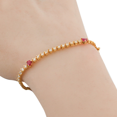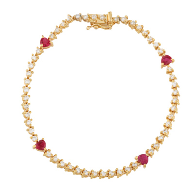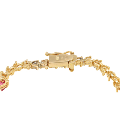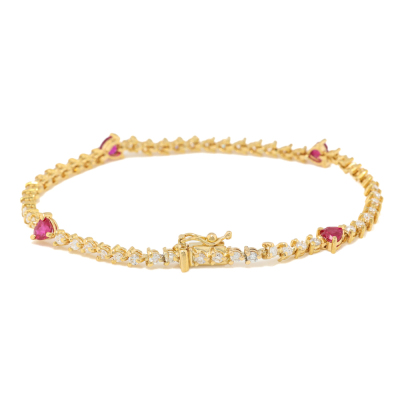 Ruby & Diamond bracelet with 4 heart shape Natural Rubies totalling 1.15ct and round Natural Diamonds totalling 1.64ct (Estimated grading: G-H SI). 18ct yellow gold. Length: 17cm. Weight: 7.4g.