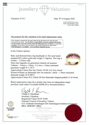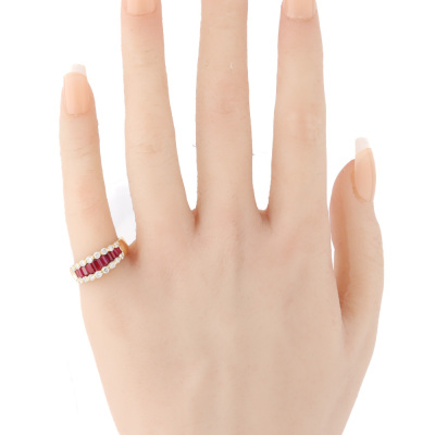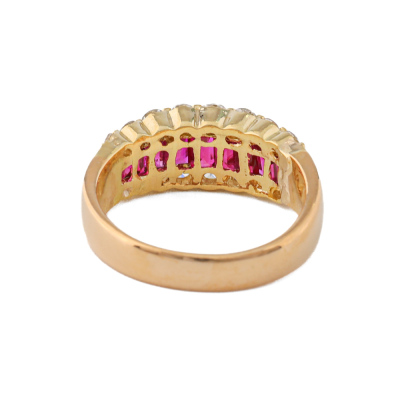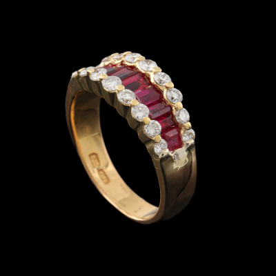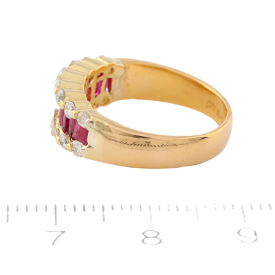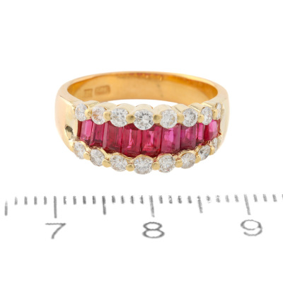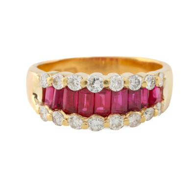 Ruby and Diamond ring with baguette cut Natural Rubies totalling approximately 1.15ct and round Natural Diamonds totalling approximately 0.50ct (Estimated grading: HIJ SI-P1). 20ct yellow gold. Ring size: K1/4. Band width: 3.4mm - 4.8mm. Weight: 5.2g. With Valuation Certificate date 08/14/2022. (Pre-owned)