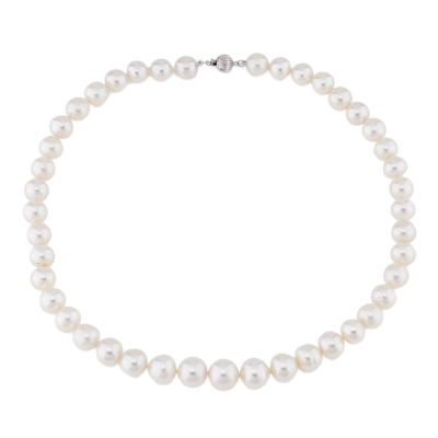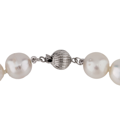 Pearl strand necklace with 43 graduated South Sea Pearls of 11.6mm - 8.9mm. 14ct white gold 7mm ball clasp. Length: 43.5cm. Weigt: 54.9g.