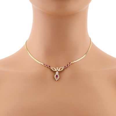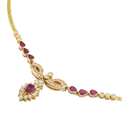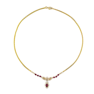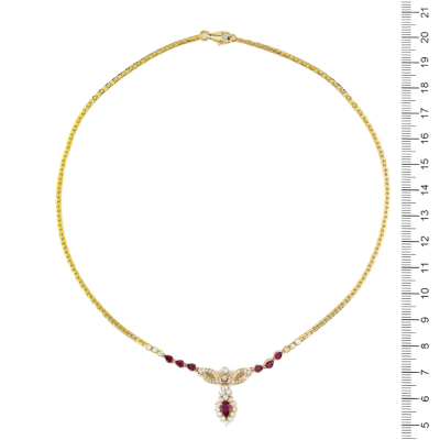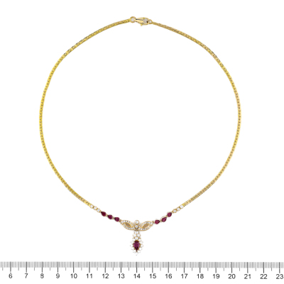 Ruby and Diamond necklace with 7 pear shape Natural Rubies totalling 1.16ct and round Natural Diamonds totalling 0.78ct (Estimated grading: G-H SI). 18ct yellow gold. Length: 40cm. Weight: 12.4g. (Pre-owned)