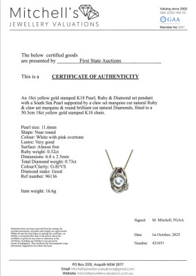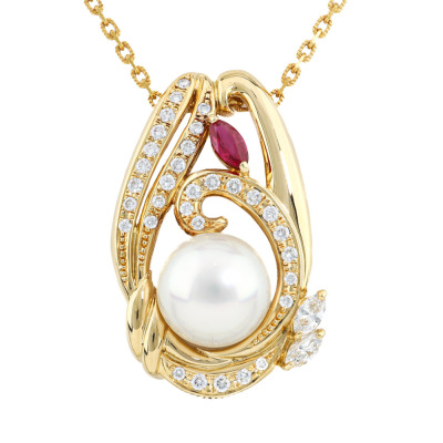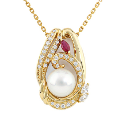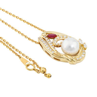 Pearl, Ruby and Diamond pendant with South Sea Pearl of 11.6mm, oval shape Natural Ruby of 0.32ct and round Natural Diamonds totalling 0.73ct (Estimated grading: G-H VS). 18ct yellow gold with 50.5cm 18ct yellow gold adjustable chain. Weight: 16.6g. With Certificate #421651.