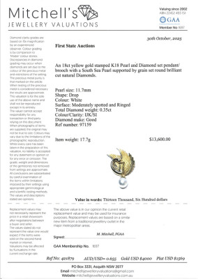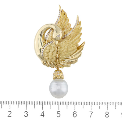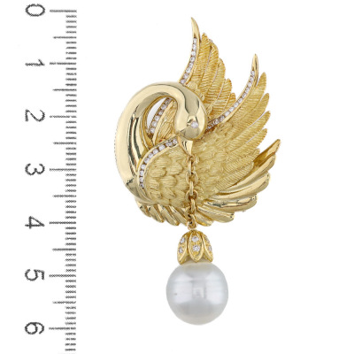 Swan design brooch/pendant with a oval shape South Sea Pearl of 11.7mm and round Natural Diamonds totalling 0.35ct (Estimated grading: IJK SI). 18ct yellow gold. Dimensions: 6.0cm x 3.0cm - including Pearl drop With Certificate #421879.